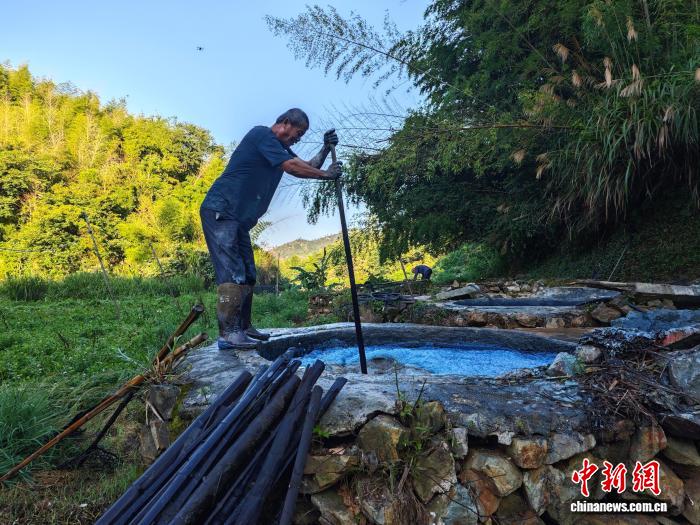 图为在福建省莆田市仙游县书峰乡四黄村,村民戴振海正在进行仙游青靛提炼技艺中的“打蓝”步骤。唐刚 摄