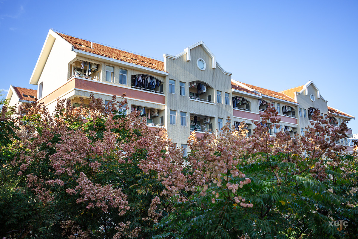守在宿舍楼前的栾树与阳台飘动的衣影构成了一幅画