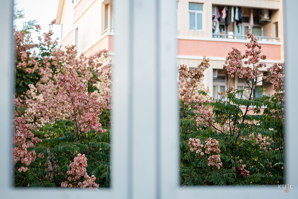 一串串灯笼状的粉色果实与建筑的反光交织