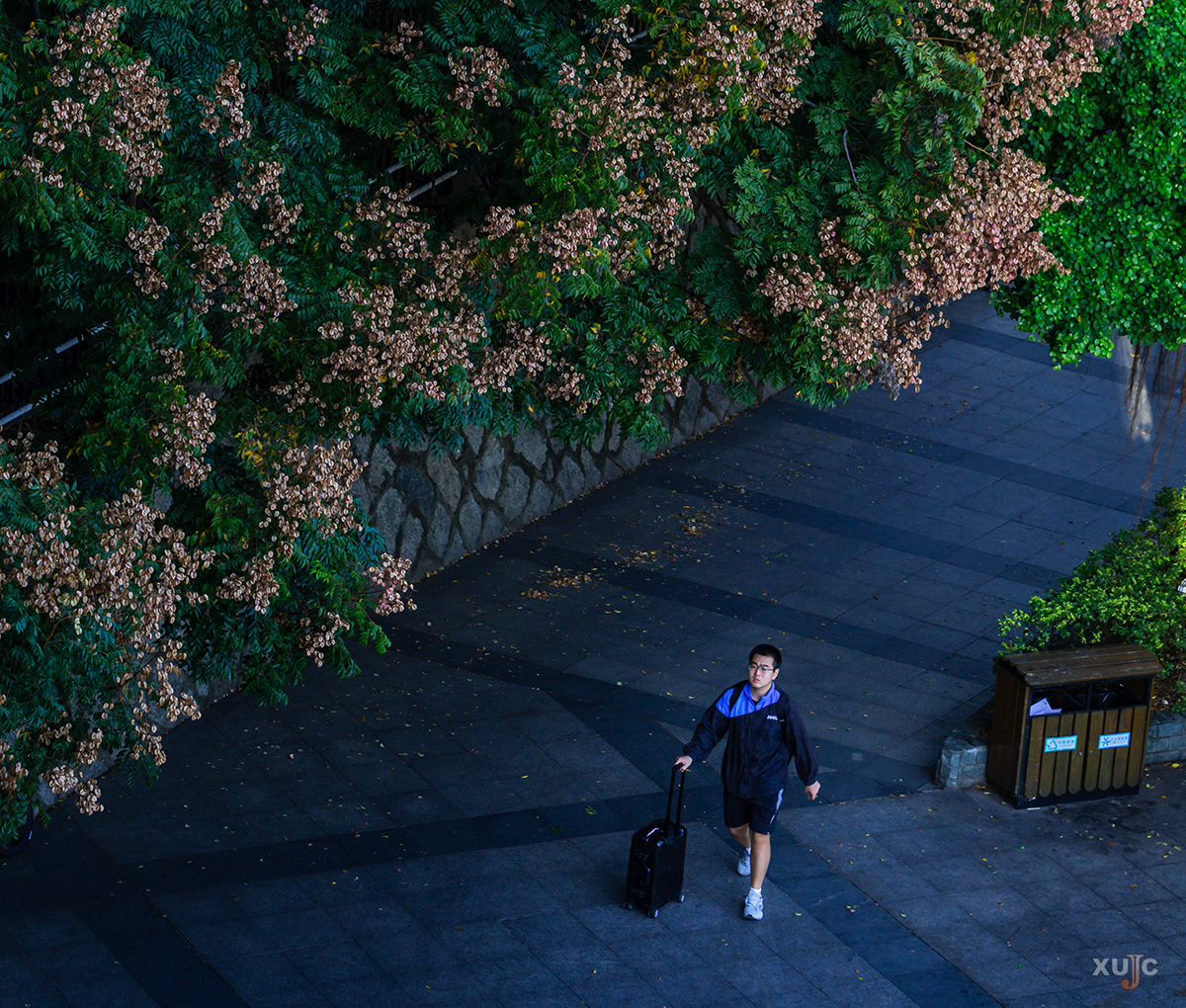 拖着行李箱的学子走在栾树下