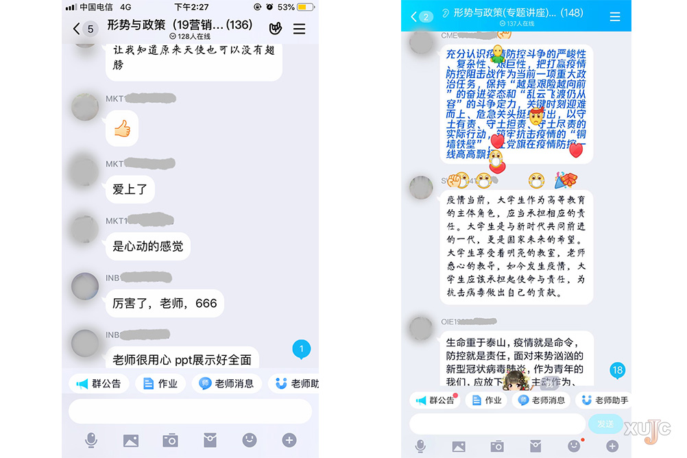 老师们的用心备课,也得到了学生们的有趣反馈。表白刷屏,为首次当主播的老师打了一针强心剂。在课后线上讨论时,各位兼职教师也纷纷为学生们的积极配合互动讨论点赞,并讨论授课软件平台的使用效果,为下一次课做规划调整的准备。