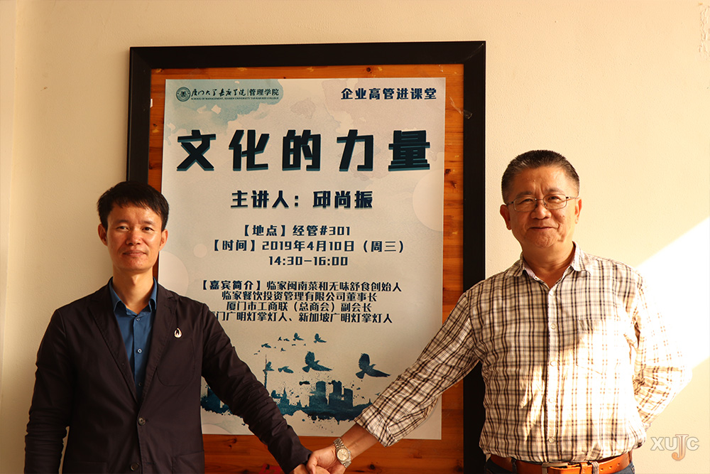 4月11日,在经管大楼301教室,管理学院企业高管进课堂活动在此举行。临家闽南菜董事长邱尚振走进管理学院的课堂,带来了一场主题为“文化的力量”的讲座。