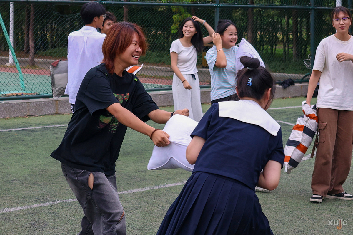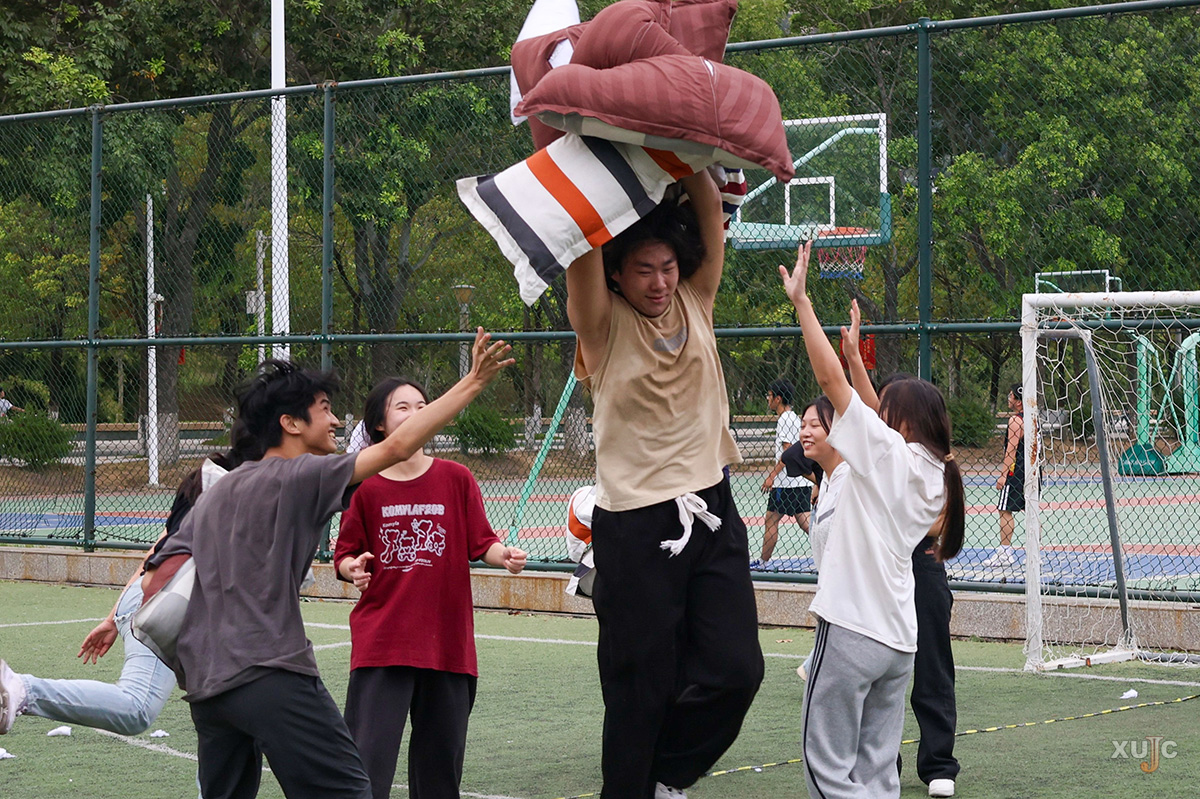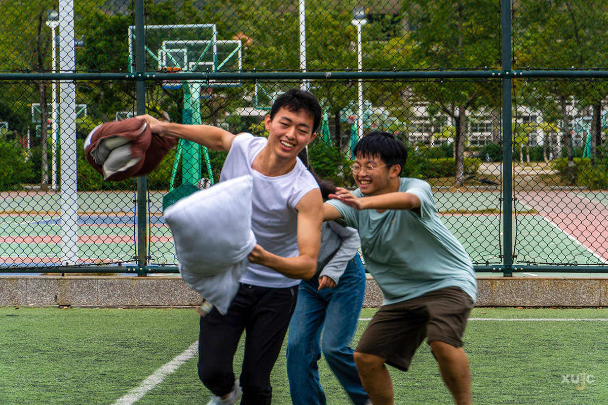 在最后的枕头大混战中,每个同学都可以拿起枕头向周边抛掷。哨响过后,同学们上演起追逐战的戏码,闹作一团。在这场淋漓尽致的“厮杀”中,压力与烦恼随着一个个枕头的抛出而消除。