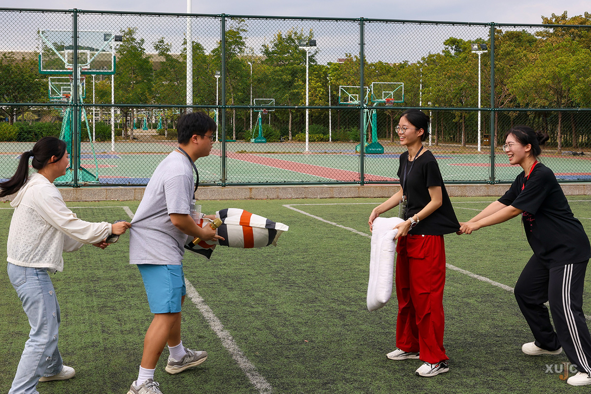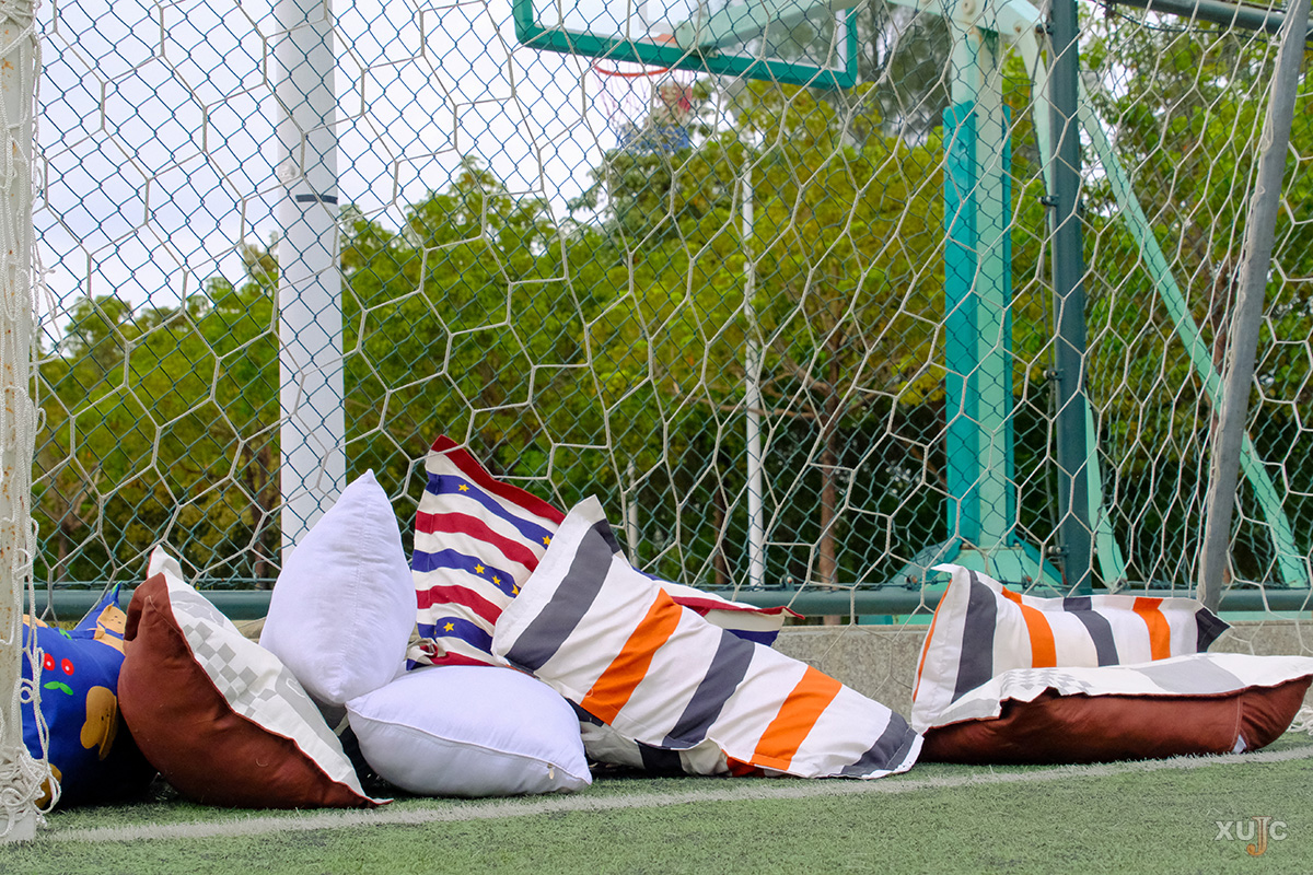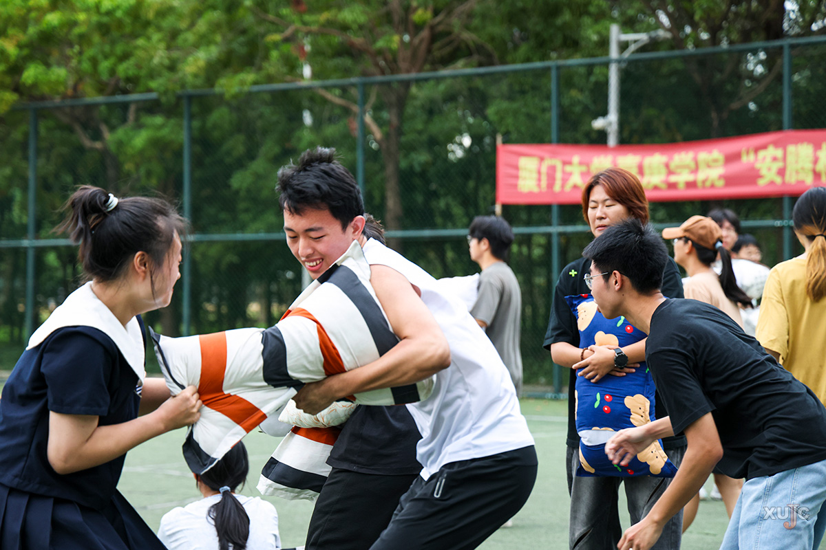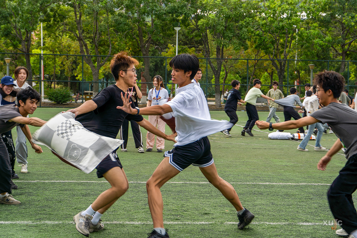 在最后的枕头大混战中,每个同学都可以拿起枕头向周边抛掷。哨响过后,同学们上演起追逐战的戏码,闹作一团。在这场淋漓尽致的“厮杀”中,压力与烦恼随着一个个枕头的抛出而消除。
