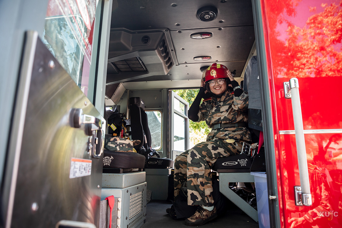同时,活动现场的消防车成为了新生们关注的焦点。新生们有序地进入消防车内部参观,近距离、直观地了解消防车的功能结构。