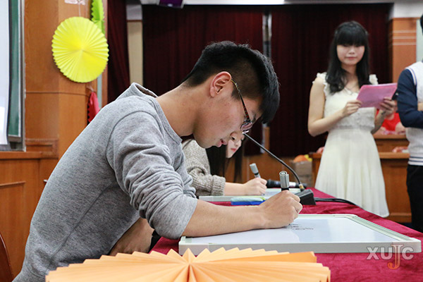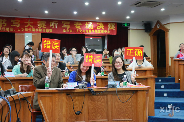 4月22日晚上,第五届汉字书写大赛听写专场决赛暨颁奖典礼在人文大楼B301教室隆重举行。在上百名选手中“锤炼”出来的16名听写精英捉对厮杀,频频上演精彩对决。许多师生来到了比赛现场,为参赛选手加油助威,见证冠军的诞生。