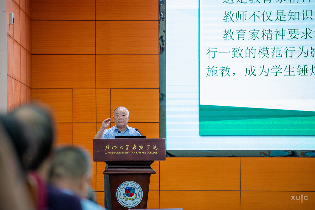 本次讲座特别邀请了马克思主义学院付汉生教授作题为“以‘嘉庚’为炬 承教育之魂——教育家精神引领下师德师风建设的思考”的专题报告。作为一名从教四十多年的老教师,付汉生教授长期从事思政课教学与研究工作,教学经验丰富,理论功底深厚,深受师生好评。