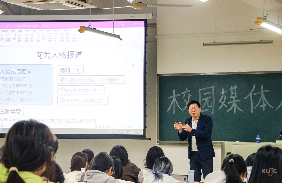 在互动环节,黄洪波将课堂带入实战。他抛出几篇优秀人物报道,邀请校园记者们现场运用“加减乘除”进行分析。大家围绕实例稿件争相发言。