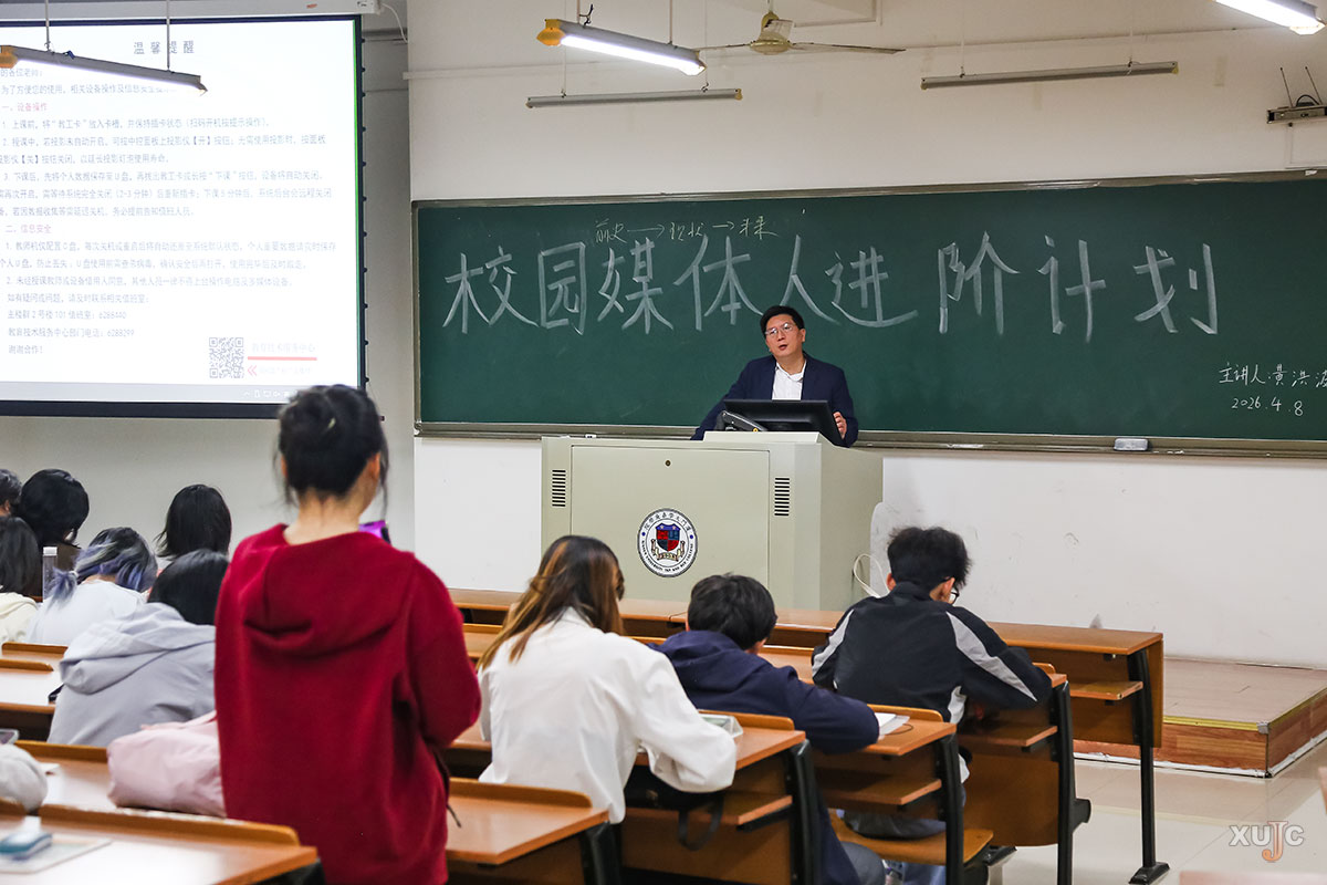4月8日,2026校园媒体人进阶计划之“校园人物报道写作探讨”讲座在主楼群2号楼201教室举行。人文与传播学院高级讲师黄洪波为校园记者们提供了一套“加减乘除”思维系统——不是用来解数学题,而是用来破解“从平面标签到立体灵魂”的写作难题。
