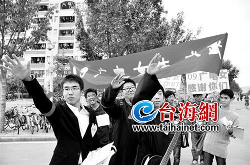 前天下午,厦大漳州校区很 “不淡定”:一支华丽的队伍出现在校园里,两位男生举着“肃静”、“回避”的牌匾走在最前面,后面跟着一群男生,身穿表演服、背插彩旗,还高打着“09广电女生威武”红色横幅。这帮人一路高喊 “09广电女生我们爱你们!”等口号,引得路人争相围观。09广电班的女生闻讯而来后,只见09广电班班长王昊站在椅子上,开始演讲 “宣誓”:“我志愿为09广电所有女生服务,维护女生的权益,履行09广电男生的义务……”幽默的表白赢得女生的阵阵掌声,最后所有男生在副班长黄枭的吉他声中合唱励志影片《老男孩》的主题曲,把整场活动推向了高潮。