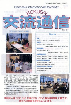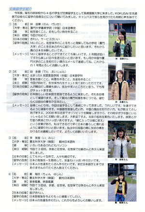 翻译: 交换留学生介绍: 今年有4名从海外姐妹学校来的交换留学生来到了长崎国际大学。KOKUSAYI交流通信就他们对于留学的抱负等想法,对他们进行了采访。如果在校园中见到了他们,可以与他们打招呼并进行交流。 姓名:林艺华 学校:厦门大学嘉庚学院(中国)日语系 兴趣:画画,制作有意思的小东西 来日本的经验:这次是第一次 对于留学的期望和抱负:进一步了解长崎国际大学,佐世保市的情况,并且向日本的朋友们介绍我的学校厦门大学嘉庚学院。亲身体验真正的日本。 我的话:这次能来长崎国际大学留学,感到非常高兴。一年的时间很短,因此想好好地快乐地度过每一天。如果想了解中国或者厦门大学的情况,可以用邮件和我联系。之后的这一年里,请大家多多指教。 |