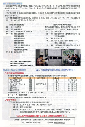 | 翻译: 新缔结的姐妹学校情况介绍: 长崎国际大学至今与中国,韩国,美国,英国,澳大利亚等大学缔结了国际交流协议。并且学校之间进行着交换留学生的活动。 2005年4月与台湾崇右技术学院缔结协议之后,在同年7月又与厦门大学嘉庚学院交换了学术交流相关的协议。 厦门大学嘉庚学院简介: 厦门大学嘉庚学院是厦门大学的独立学院,学院下设16个系。 建校时间:2003年 学校地点:福建省漳州市(离厦门市乘船15分钟距离) 学校性质:本科大学 专业设置:日语,英语,法律,国际经济与贸易,艺术设计,音乐学等 规 模:1万人(至2006年3月学生数为5000人) 图2中照片左边的文字说明: 九州文化学院与厦门大学嘉庚学院进行会谈的情景(左侧为嘉庚学院王瑞芳院长,右侧为安部直树理事长) |