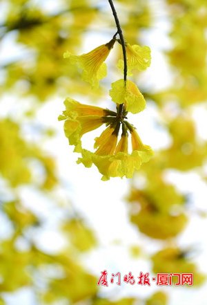 据了解,黄花风铃木原产于中南美洲,花冠呈漏斗形,状似风铃,三五朵花簇拥成花球,婀娜多姿。微风一吹,摇下一地“黄金”。黄花风铃木的自然花期为3月至4月。这种花木会随着四季变化而更换风貌,春天枝条叶疏,夏天长叶结果荚,秋天枝叶繁盛,冬天枯枝落叶,春华、夏实、秋绿、冬枯。