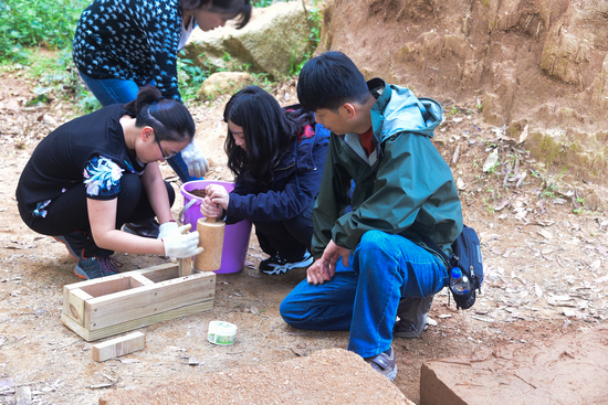 “捶打土壤时,请将锤子举高,利用重力与外力使夯土变得更容易,另外,土壤之间也会更加紧密。”李鎨翰一边拿着夯锤捶打土壤做示范,一边向参与制作的大学生讲解注意事项。不一会儿,现场交响着因捶打土壤而发出的咚咚、嗒嗒声。“当捶打声从浑浊变为清脆,则可基本判断夯土完成。”李鎨翰补充说明。