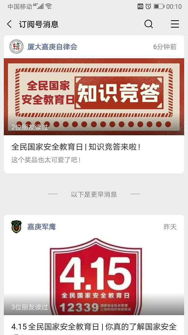 此外,我校积极动员学生参加“2020年全国大学生国家安全教育知识竞赛”,在学工部、团委与法学院联合指导下,青年志愿服务指导中心和“居安思危·人人学”应急救护志愿者服务队推出为期两周的“疫”点点安全知识打卡活动,在全校学生中进一步普及疫情防控和应急救护生命健康安全常识,为宅家期间和复学后的疫情防控做好衔接。大学生自律委员会也推出“全民国家安全日知识竞答”,鼓励学生积极参与竞答获取线上奖励。通过这些寓教于乐的知识在线问答活动,激发学生学习国家安全教育知识,牢固树立总体国家安全观。