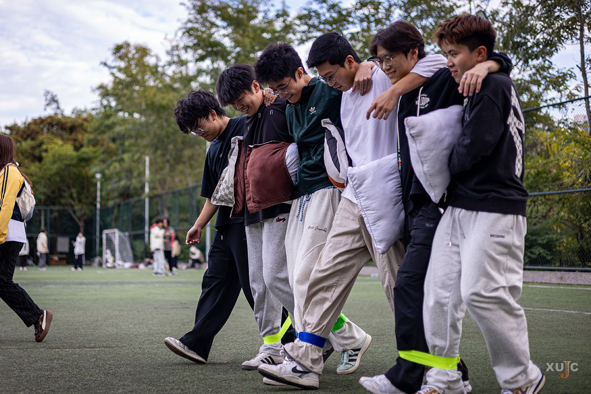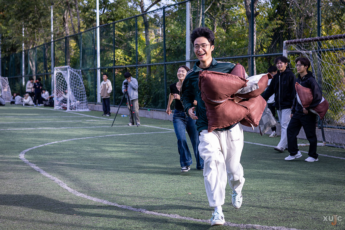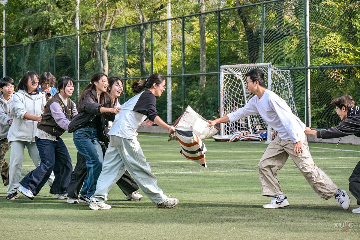 第二轮游戏规则有所变化,参与者重新随机组成6个阵营,进而形成三组对立阵营,每个阵营人数为10人。每个小组都有对应的足球框作为大本营。在这一轮,同学们为了将枕头送到对方大本营,各出奇招,现场一片欢腾,呼喊声、欢笑声交织在一起。