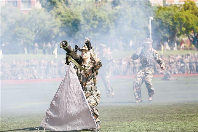 厦大嘉庚学院军训结业汇演火力掩护进攻演练。(朱鲜艳 摄)
