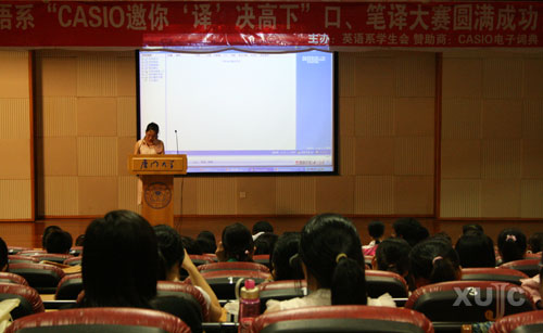 5月28日晚上七点,我院英语系“CASIO邀你——‘译’决高下”口译决赛暨口、笔译颁奖大会在主楼群3号楼小报告厅举行。我院英语系主任雷天放副教授,厦门大学英语系苏伟老师,我院英语系专职教师杨昆老师、洪诗谐老师、王政老师、邓婕老师和郭喜凤老师出席本次大赛并担任评委。