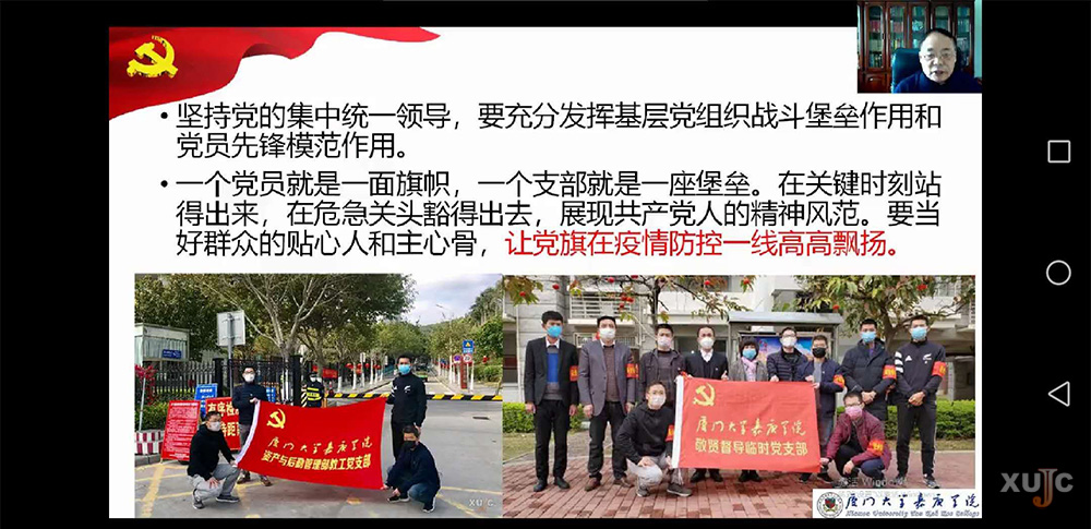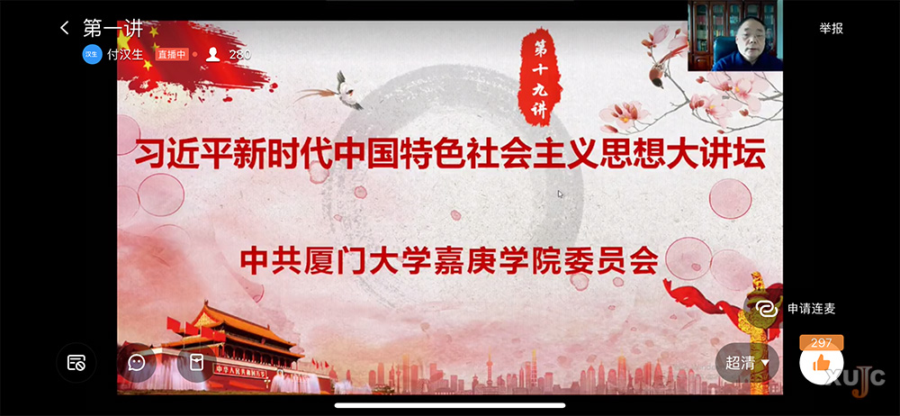 经过精心准备,2月26日下午,第一堂“线上党课”暨习近平新时代中国特色社会主义思想大讲坛第十九讲正式开讲。思想政治理论教研部主任付汉生教授以“发挥制度优势打赢疫情防控总体战”为主题,从“中国特色社会主义制度体系的显著优势”“中国特色社会主义制度优势的实践成效”和“坚持制度自信打赢疫情防控总体战”等三个方面,深刻阐述了我们打赢疫情防控总体战的信心和底气所在。嘉庚学院党委书记林辉、党委副书记王洁松,师生党员代表等500余人听取了讲座。