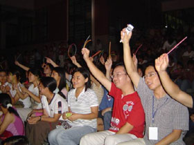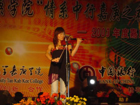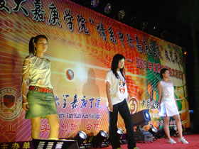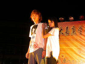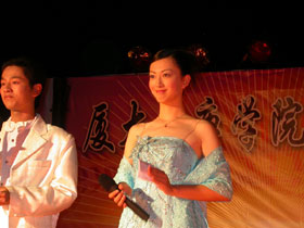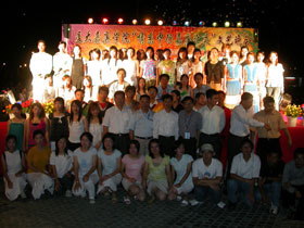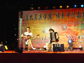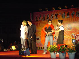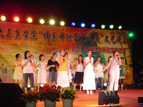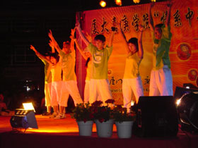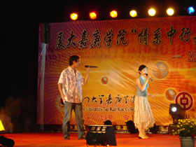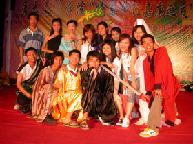 | 汪涵 、洪恩怡等的藏舞《打青稞》 | “嘉庚之夜”文艺晚会主持人与英语短剧《大话西游》表演者的合影 |