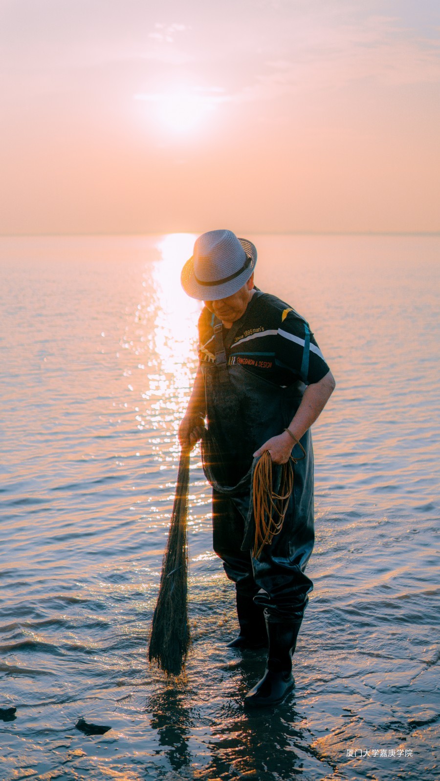 图中为一位年迈的渔民,在夕阳下进行着最后的捕捞。