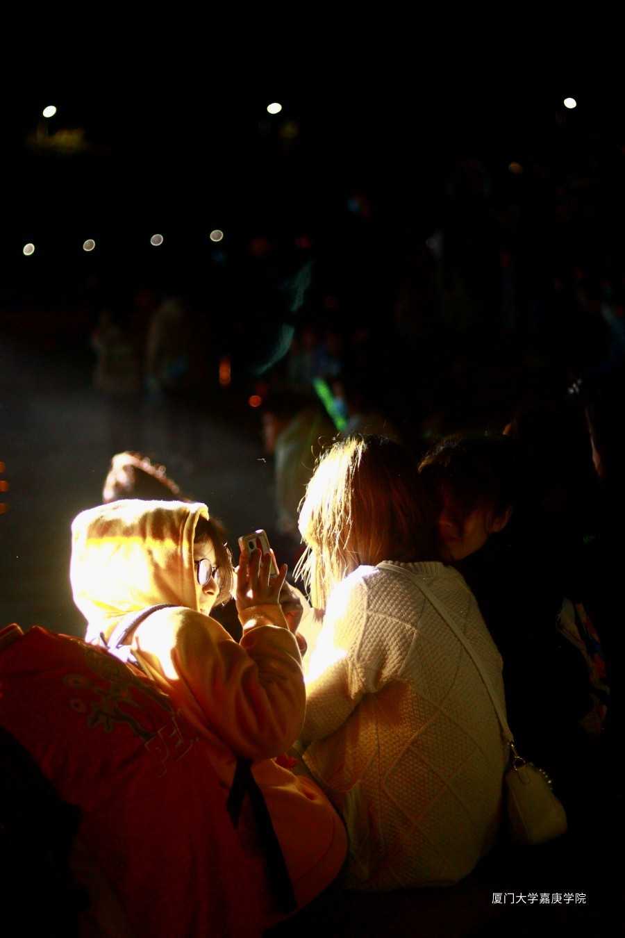 拍摄于嘉庚大舞生比赛现场,一束舞台灯打到两位观众的身边,正巧同学穿着的暖色衣服和舞台的暖光灯与黑暗的背景形成鲜明对比,同学飘扬的发梢和转身拿手机拍摄同学的动态生动丰富,给画面增添了故事感。