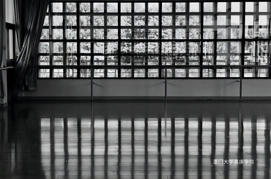 在嘉的人文楼里,利用了光线与嘉庚的独特设计结合,利用的点线面构成组成了这幅作品