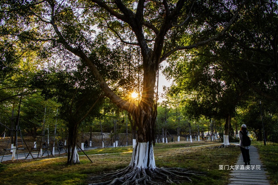 该张照片拍摄于2021年12月7日,闲暇的午后,约上好友一起背起行囊漫步“嘉园”,我们一起追光逐日捕捉每一个细节,黄昏的太阳也分外温和,少了几分刺眼,当太阳落在大树上时,我迅速按下快门,记录这个美丽的画面。