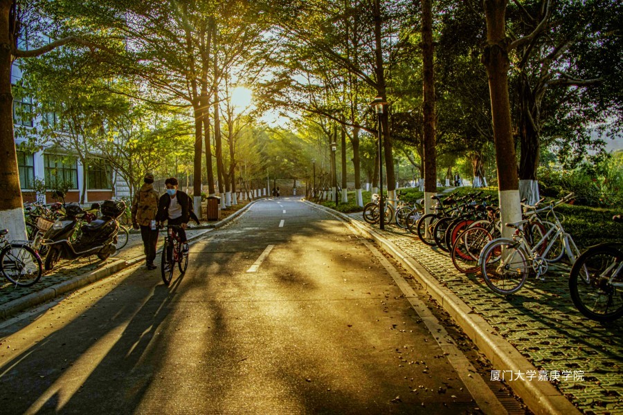 该张照片拍摄于2021年12月7日,阳光洒落地面,“嘉”人们则有的骑着自行车,有的步行,他们怡然自得地享受着午后的阳光,逛着如诗如画的“嘉园”,阳光透过树叶,留下点点光斑。