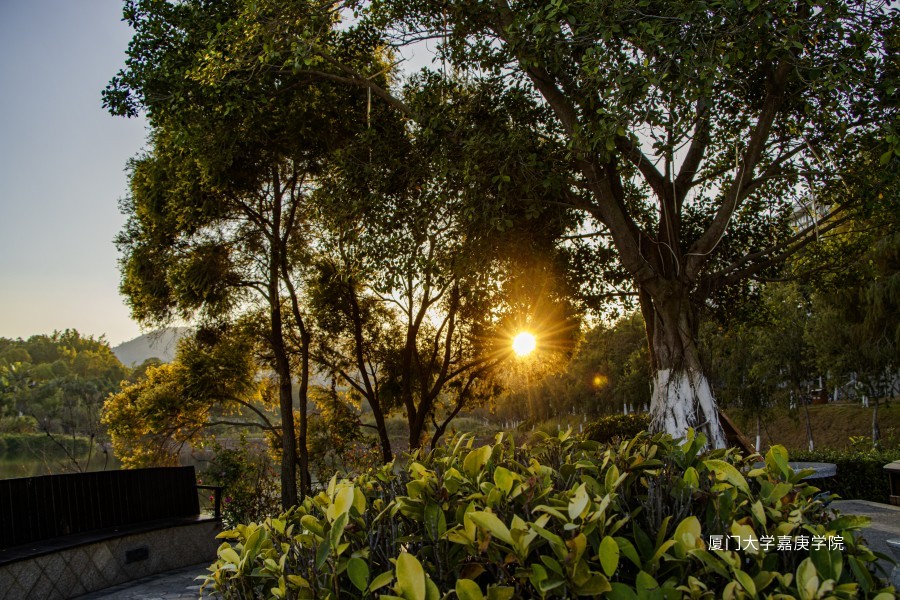 该张照片拍摄于2021年12月7日,午后的阳光穿过树叶间的空隙,透过雾蒙,一缕缕地洒满了校园。太阳更低了,架落在树梢,照耀着花圃。