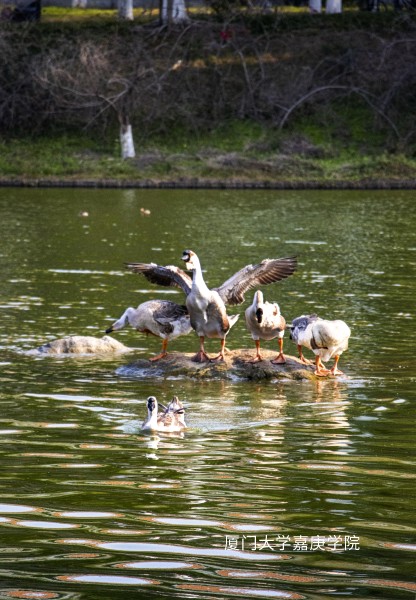 第一次在校园里拿起相机,拍下了学校的原住民——白天鹅,它们聚集在一起,站在湖中礁石上,心心相印。