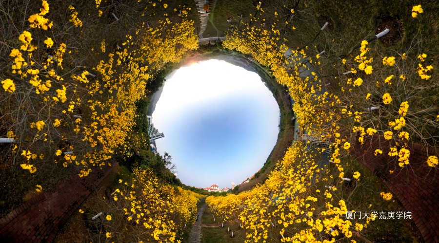 航拍全景视角下 黄花风铃木成了时空隧道