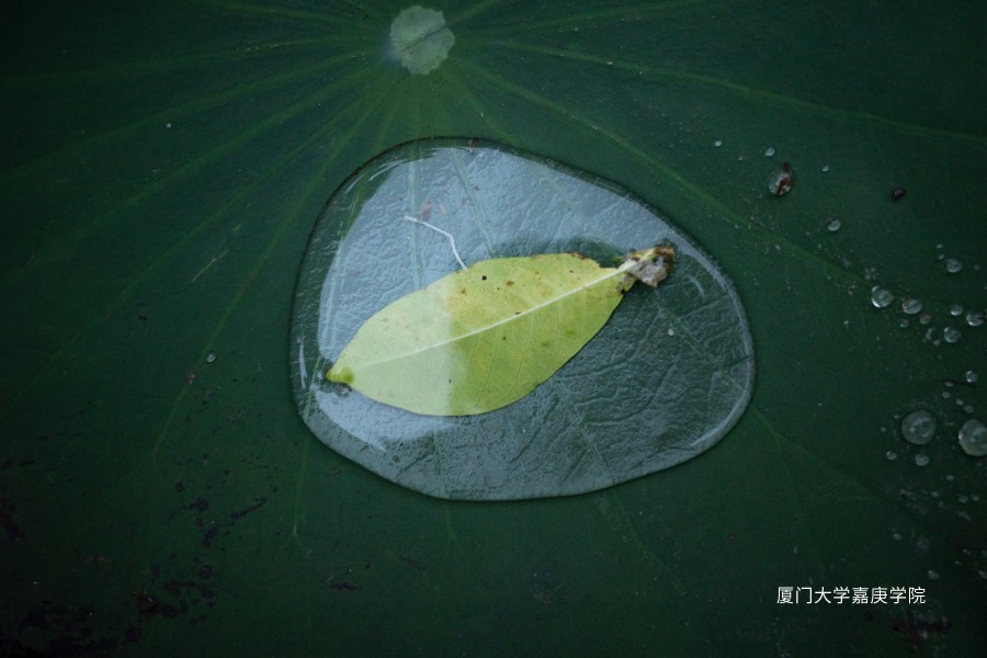 低头突然发现一片叶子被水包住了。