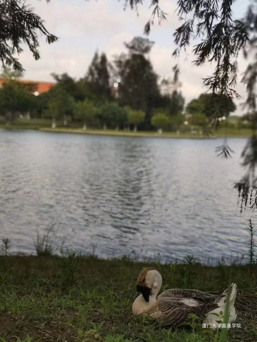 简述:湖边丛里,“嘉园”的大白鹅结束了一天的“工作”,小憩一旁。