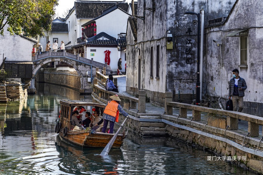 江南水乡的特色即小桥流水人家。主人轻摇船桨,船体漂流在水面,水波荡漾,意境十足。