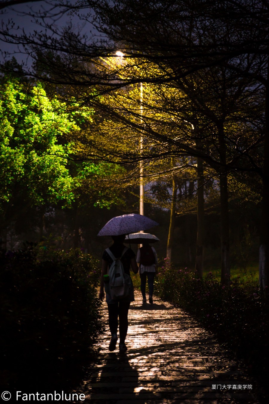 下课后,走在南区山顶的小路上,灯光和树枝相映
