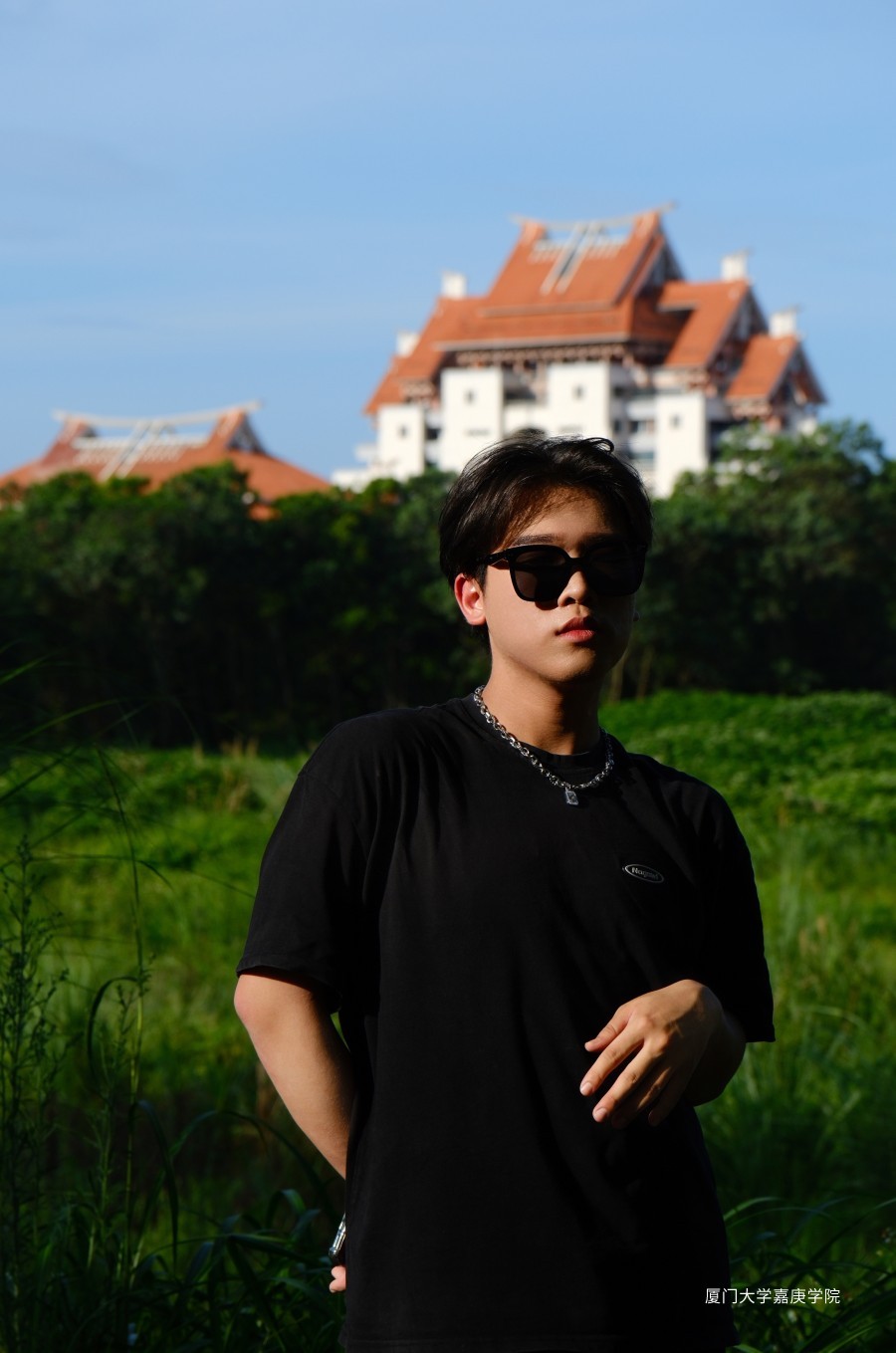 身后是主楼群和一片草长莺飞的绿地