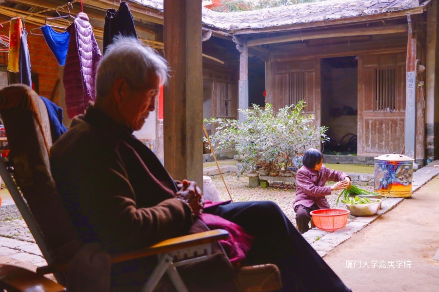 爷爷在躺椅上小憩,奶奶在一边筛菜