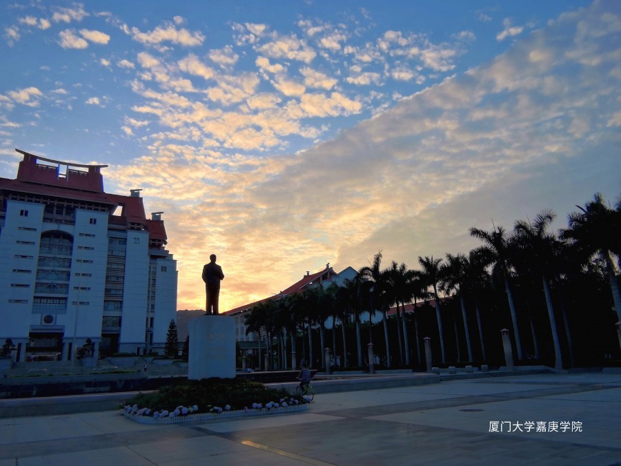 夕阳,云朵和嘉庚雕像相辅相成,在傍晚之美中又不乏庄重感。