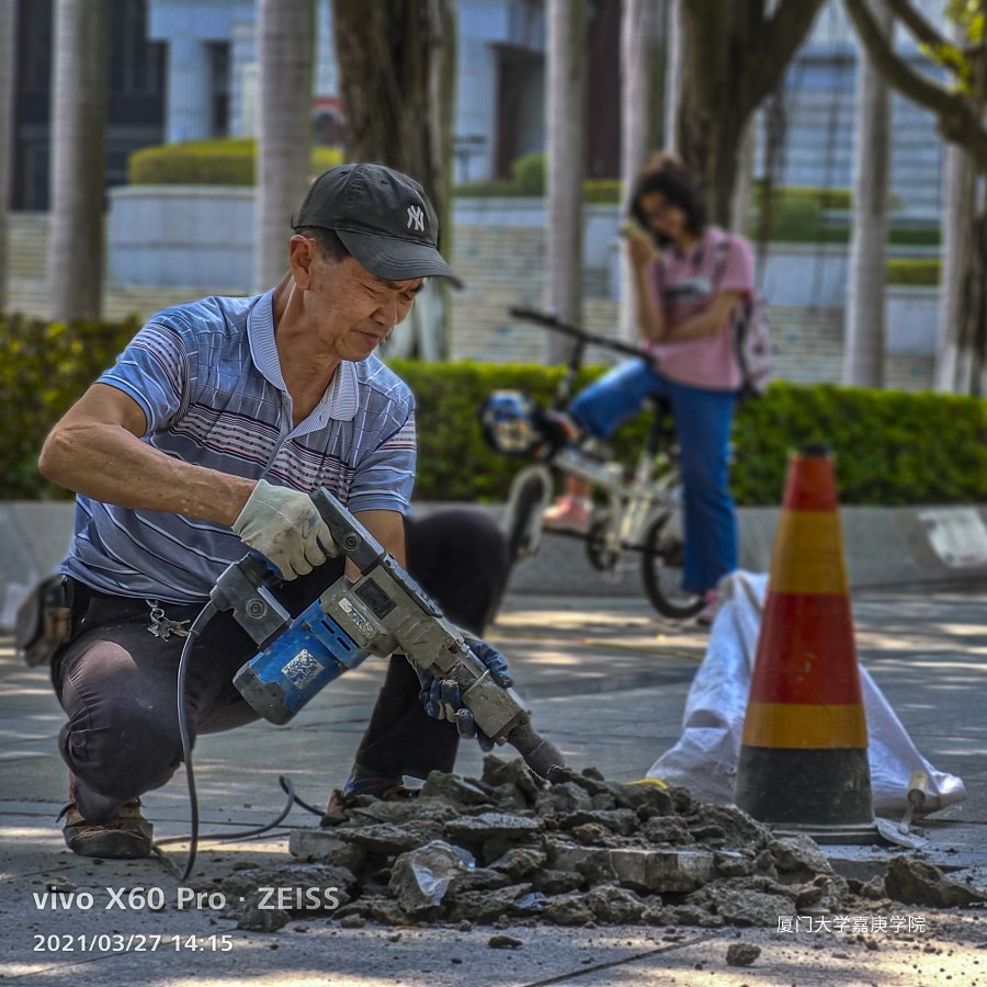 彩虹跑的当天,欢快的气氛浓郁,但是工人叔叔仍是认真的做着工作,周围的同学们欢乐的笑着,期待着,叔叔敬业的态仿佛在表示着快点完成,让同学们更安全的出行。