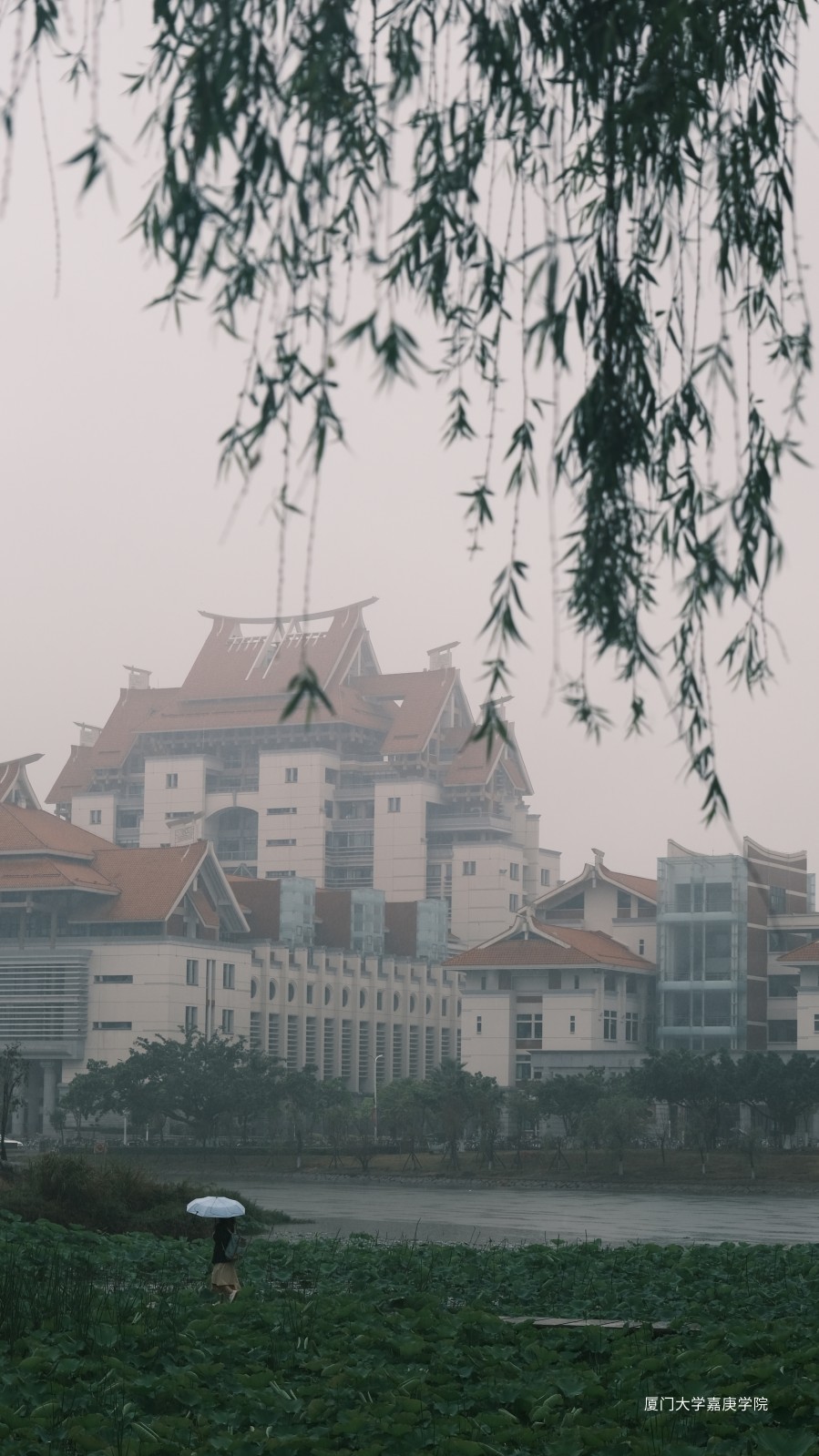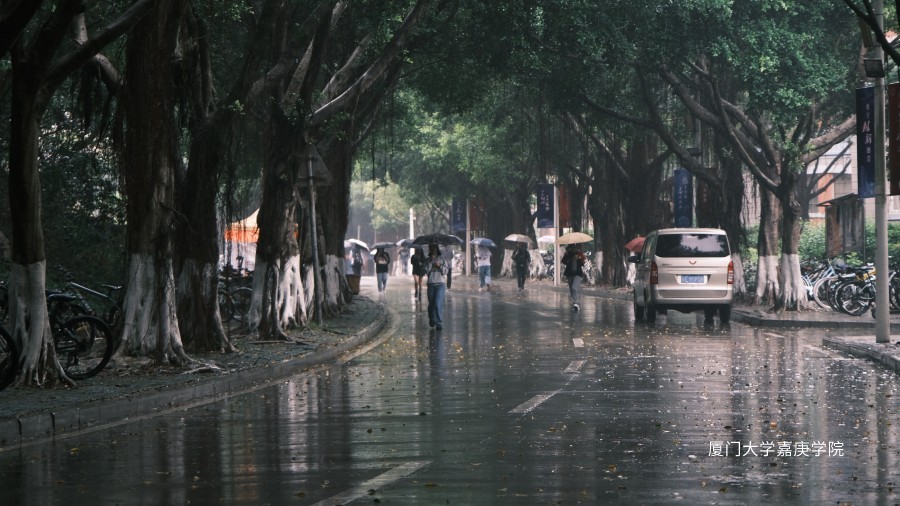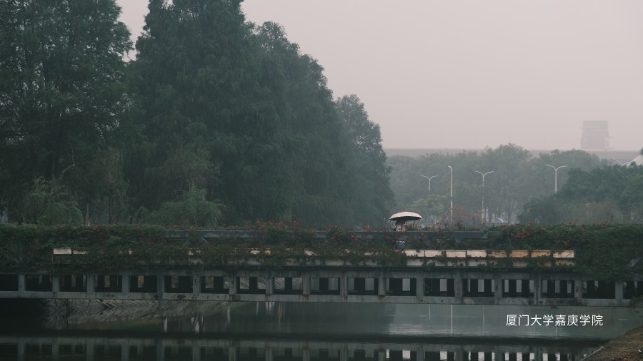 春雨贵如油,三月的嘉庚被雨雾笼罩,行人撑着雨伞在校园中穿行