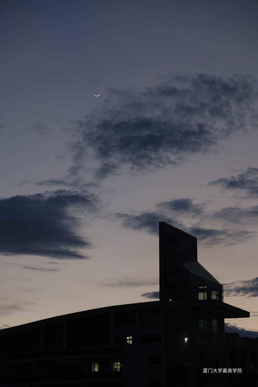 落日躲进山林,留下弯弯的月亮挂在天空,在晚霞上打了一个勾。