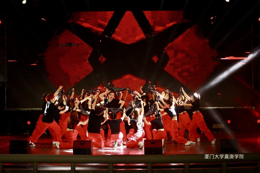 拍摄于大舞生现场,定格了表演者聚在一起的动作,体现他们的团结和谐,红色的主色调彰显着嘉庚学子的火热奔放与青春活力。一束光从右侧打入·,丰富了画面。