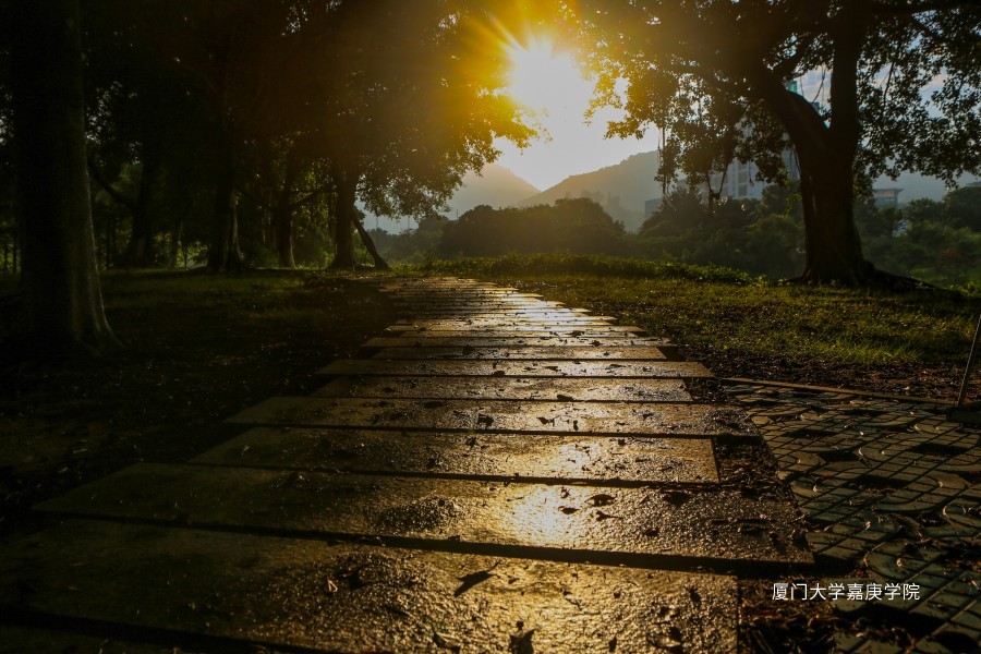 雨过天晴,余晖洒落还未干透的小路,静谧幽深