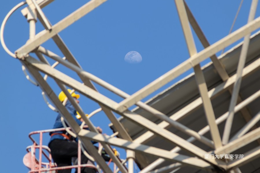 下午,工人们正在维修嘉庚学院风雨球馆。
