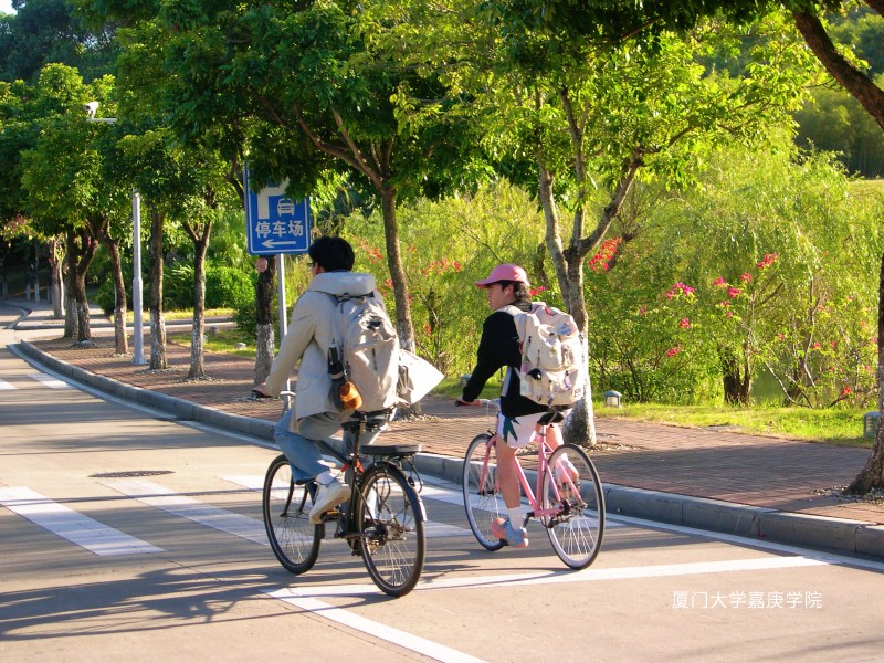 晨光穿过绿树,两人骑车并肩而行,嘉庚的日常藏着青春的默契。