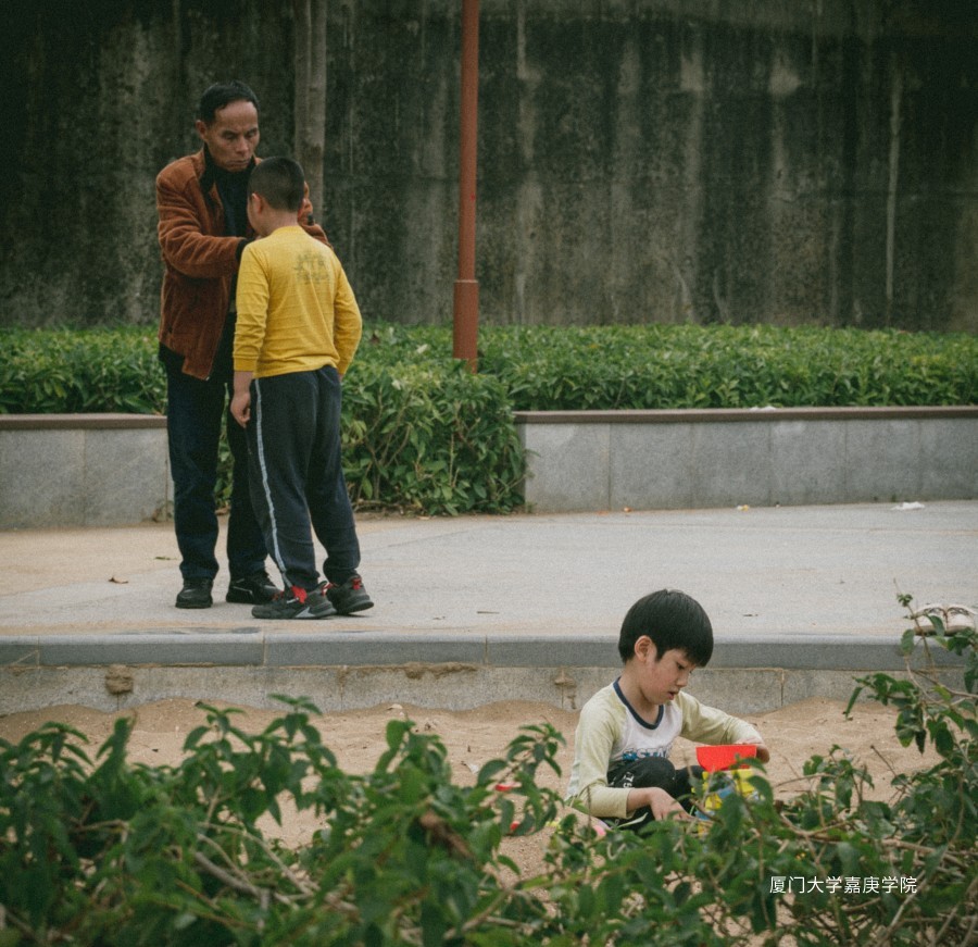 2021年2月于南宁河堤公园拍摄。新春佳节,在河堤散步时偶遇三人——一老人训斥一孩童、独自玩沙的男孩。画面看似和谐共生,实则暗含一些思考,例如教育、亲情、陪伴等。两组人物的对比,其实是回忆自己童年快乐或是烦恼,同时也在思考每个家庭对于教育观念的差异。