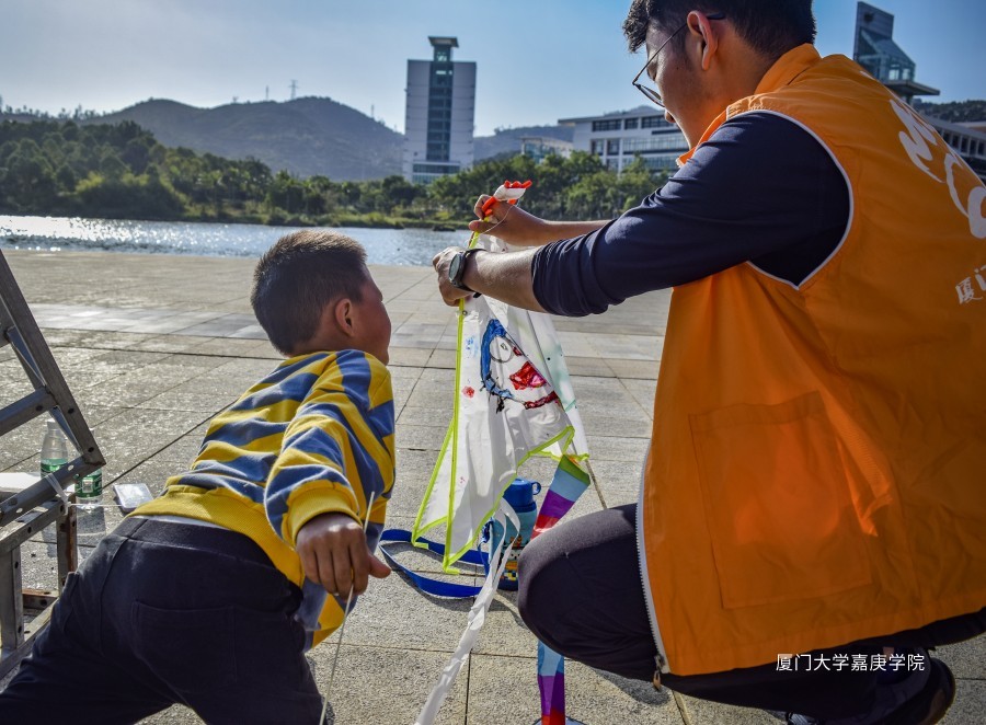 重阳节活动中,志愿者与小朋友合作完成了手绘风筝作品