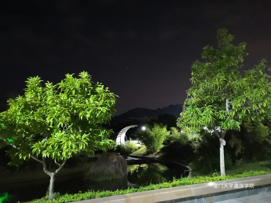 夜晚,我喜欢约三五好友一起在嘉园里漫步,我们一起走过弯弯的步道,一起穿过造型优美的树枝,好像走进了那个梦幻而澄澈的童话王国。
