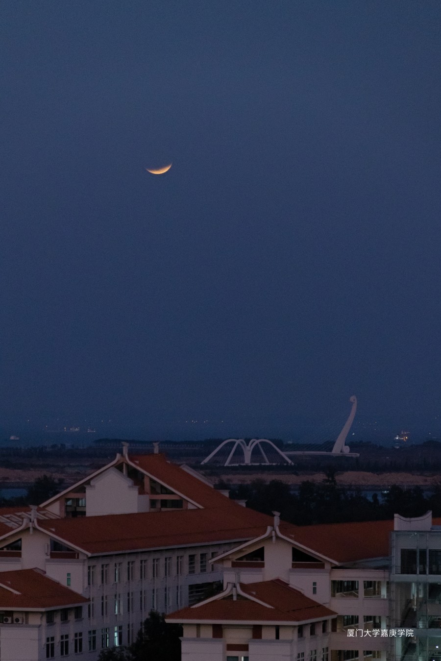 蓝调时间下金黄的月亮达到食甚时刻,静谧地悬停在空中